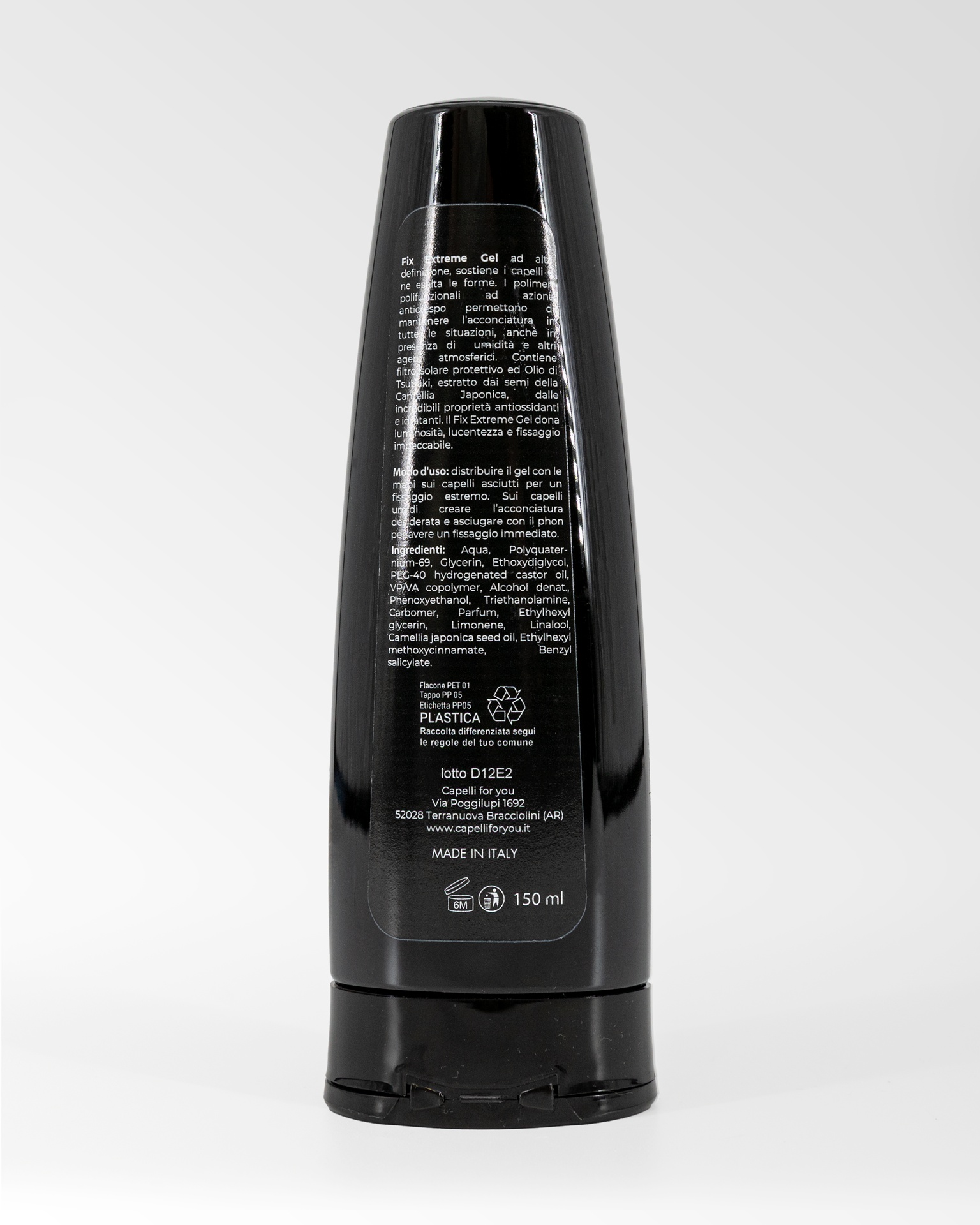 Modo d’uso: distribuire il gel con le mani sui capelli asciutti per un fissaggio estremo. Sui capelli umidi creare l’acconciatura desiderata e asciugare con il phon per avere un fissaggio immediato.